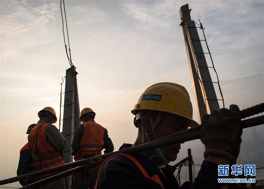 8月11日,工人在武漢綠地中心項目建設現(xiàn)場近500米的高空施工。新華社記者肖藝九攝