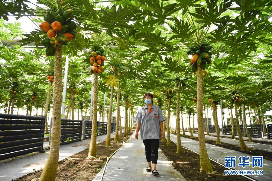 在吉林省永吉縣萬昌鎮(zhèn)宇豐紅果木瓜產(chǎn)業(yè)園,工作人員在大棚內(nèi)管護(hù)木瓜(8月12日攝)。新華社記者 許暢 攝