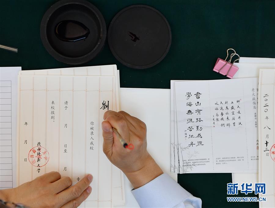 8月13日,陜西師范大學(xué)在職教師王雙懷書(shū)寫(xiě)錄取通知書(shū)。當(dāng)日,陜西師范大學(xué)2020年手寫(xiě)錄取通知書(shū)正式開(kāi)筆。該校自2007年起采用毛筆書(shū)寫(xiě)錄取通知書(shū)的方式,為新生傳遞佳音。今年,學(xué)校十余位退休教師、在職教師、校友代表等書(shū)法愛(ài)好者將為約4500名新錄取的本科生送上帶著墨香的大學(xué)錄取通知書(shū)。新華社記者張博文攝