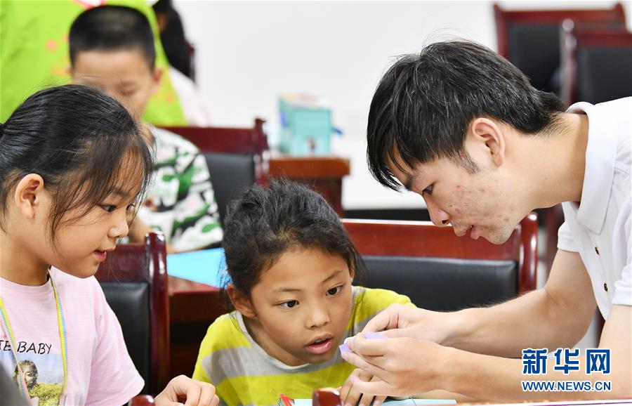 8月13日,在貴州省思南縣雙塘街道麗景社區(qū)易地扶貧搬遷安置點(diǎn),志愿者在指導(dǎo)孩子們學(xué)習(xí)剪紙。新華社記者楊文斌攝