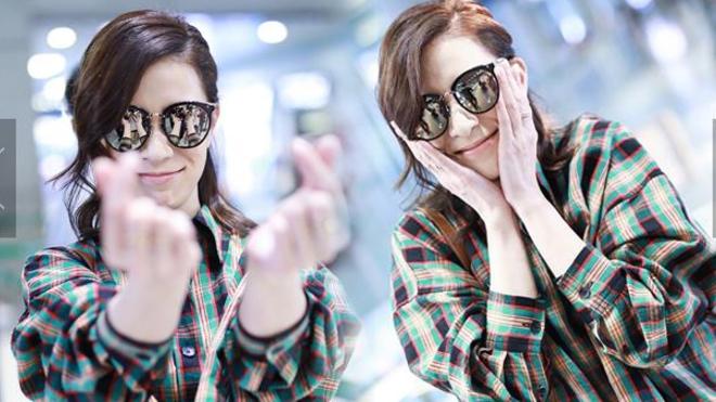 “嫻妃”佘詩曼花式比心 格紋襯衫燈籠褲顯青春