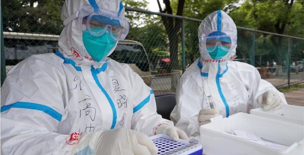 6月15日,北京市豐臺(tái)區(qū)東高地街道采樣點(diǎn)工作人員在進(jìn)行采樣工作。
