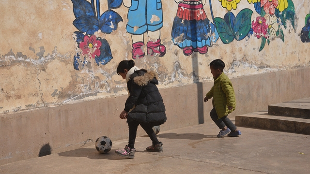 在海拔2700米高山上的瓦吾小學(xué),一群孩子們?cè)诼懵吨嗤恋淖闱驁?chǎng)上,追逐著滾動(dòng)的足球,汗水浸濕了了衣服。