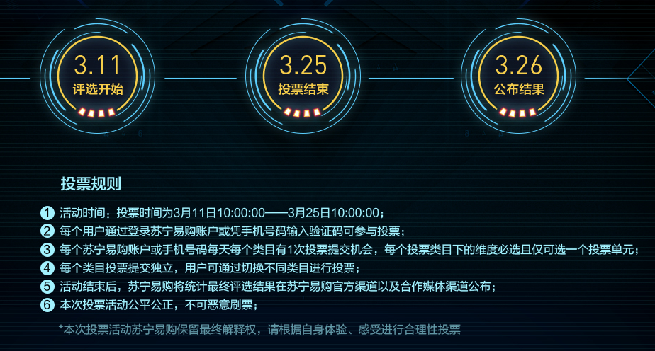 3月11日用戶投票評(píng)選開(kāi)始,3月25日投票結(jié)束,26日正式公布投票結(jié)果,活動(dòng)貫穿蘇寧易購(gòu)315全民煥新節(jié)期間,面對(duì)眾多手機(jī)、電腦、數(shù)碼新品,用戶會(huì)作何選擇?