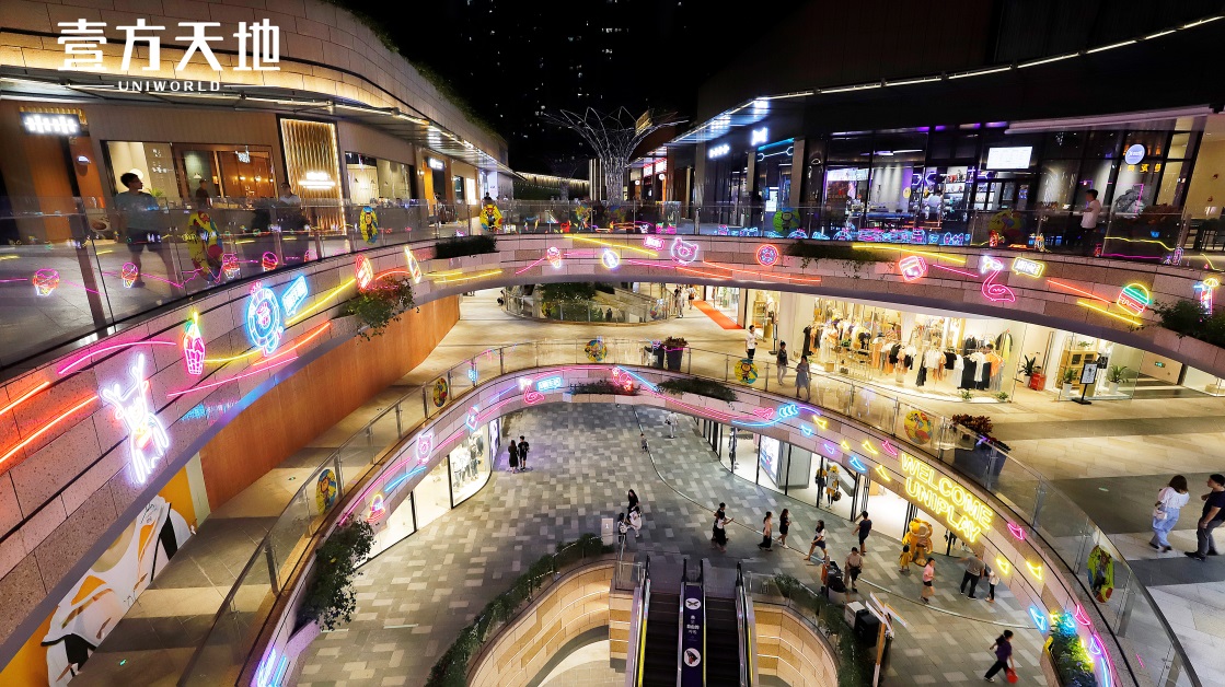 “顏值是第一生產(chǎn)力”,要打造夜間標(biāo)桿,氛圍營(yíng)造必不可少。壹方天地將燈飾與建筑、綠植等多個(gè)元素巧妙結(jié)合,璀璨的景觀燈、夢(mèng)幻的星星燈、妙趣橫生的IP主題霓虹燈烘托出獨(dú)具一格的藝術(shù)氛圍。夜晚時(shí)分搭配噴泉秀和噴霧,光影夢(mèng)幻,玉壺光轉(zhuǎn),營(yíng)造出極富層次感的夜景。同時(shí),通過加強(qiáng)外圍的燈光照明等,持續(xù)亮化夜間氛圍,壹方天地成為夜間休閑、聚會(huì)的絕佳場(chǎng)所?!跋M(fèi)者沒事也喜歡來(lái)走一走,享受工作之余的休閑時(shí)光?!迸藸N峰說道。