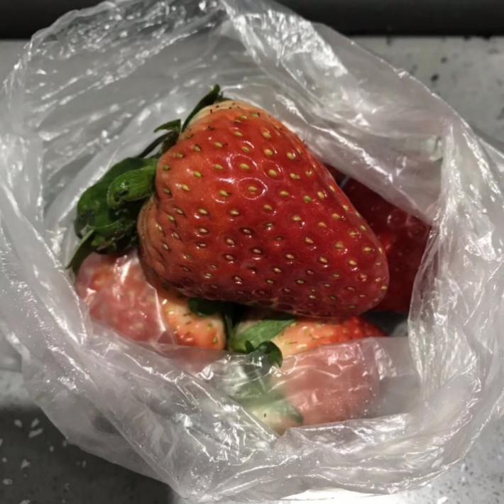 這些天,讓林濤印象最深刻的,是有一天一位老奶奶,也是他的老顧客,用保鮮袋裝了好幾個又大又紅的草莓,戴著口罩特地來到店里送給林濤。“據(jù)說那個草莓特別貴,她自己可能也不舍得吃?!绷譂?dāng)時忍不住拍了照片保存下來:“就那種時候,你會感覺,留下來,值了!”