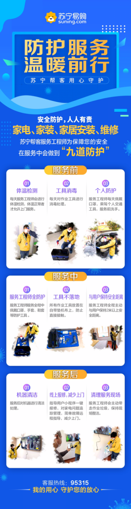 據(jù)悉,蘇寧家電“九道防護(hù)”措施涵蓋服務(wù)的前、中、后期全程。服務(wù)前,蘇寧服務(wù)工程師需進(jìn)行體溫檢測,衣物工具車輛消毒,同時佩戴口罩;服務(wù)過程中,需佩戴口罩、手套、鞋套等全套防護(hù)工具,并主動與用戶保持2米的安全距離,避免直接接觸;服務(wù)完成后,對機(jī)器進(jìn)行清潔處理,同時指導(dǎo)用戶關(guān)注報(bào)修和故障求助,帶走作業(yè)垃圾。