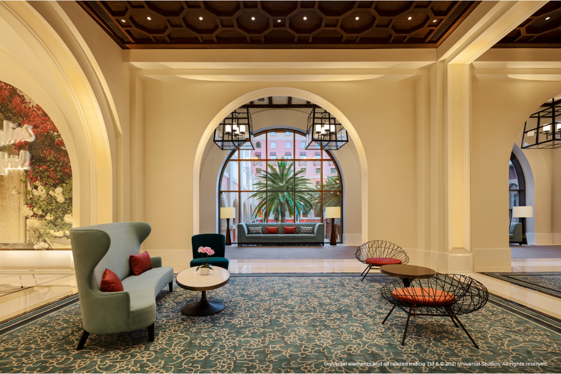 環(huán)球影城大酒店位于北京環(huán)球影城主題公園入口,入住賓客將可以俯瞰園區(qū)的絕佳景觀。作為全球首家以環(huán)球品牌命名的主題酒店,環(huán)球影城大酒店在設(shè)計中融入了極具加州特色的西班牙復(fù)興風(fēng)格,巧妙再現(xiàn)好萊塢電影黃金時代的輝煌與風(fēng)華,同時結(jié)合了中性色調(diào)的現(xiàn)代演繹以及繽紛色彩點綴。酒店大堂內(nèi)西班牙風(fēng)格的噴泉和玻璃馬賽克三角梅花墻帶來輕快靈動的熱帶海岸氣息,定制的橙花調(diào)香氛則令人仿佛置身加州,讓賓客感受到典雅而充滿活力的度假氛圍。酒店公共區(qū)域內(nèi)的珍貴電影海報將帶領(lǐng)賓客探尋動人心扉的光影世界背后,精彩絕倫卻不為人知的創(chuàng)作瞬間。從復(fù)古經(jīng)典系列,到現(xiàn)代電影杰作,更有大量的幕后花絮呈現(xiàn)一段歷久彌新的電影之旅,回溯環(huán)球超過一個世紀(jì)的電影歷史的光輝歷程,致敬品牌在光影史上的耕耘與貢獻(xiàn)。