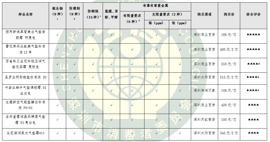 (一)8款氣墊粉底所測項目包括微生物、重金屬、防腐劑和化學防曬劑等44項指標,不僅符合國家標準要求,且符合歐盟(包含德國)、美國和日本的標準要求,品質(zhì)安全性達到國際一流標準。