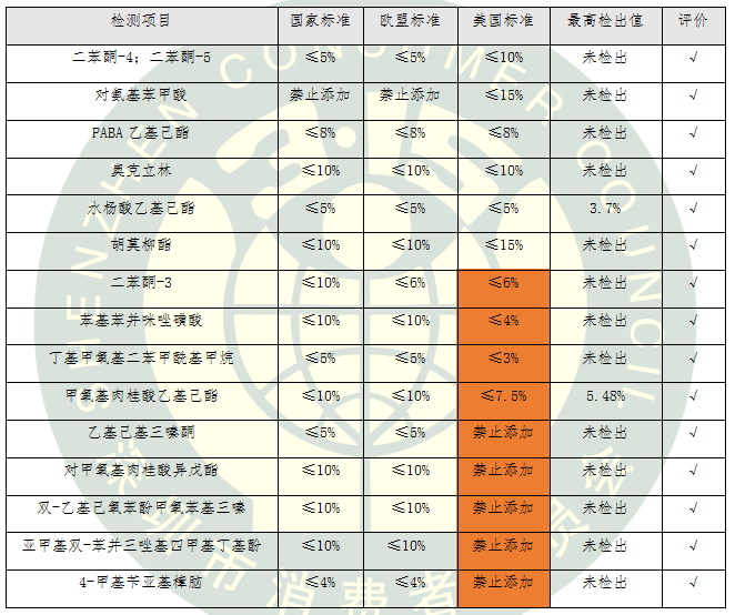 防曬化妝品在美國按非處方藥(OTC)管理,新的防曬劑當作新藥品來批準,審評要求非常嚴格。本次比較試驗測試的15類化學防曬劑按照國標、歐標和美標中最嚴格的標準進行評價。我國允許使用的5類化學防曬劑在美國被禁止使用,還有4類化學防曬劑在美國的限量要求更加嚴格。