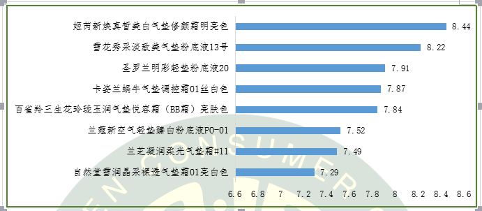 本次感官評價采用行業(yè)通行的測評方法,由9名具有氣墊粉底使用經(jīng)驗,平均年齡在28歲的女性消費者,連續(xù)8天對高度關(guān)注的6個性能指標進行了測評,最終得到8個樣品感官評價綜合結(jié)果如下: