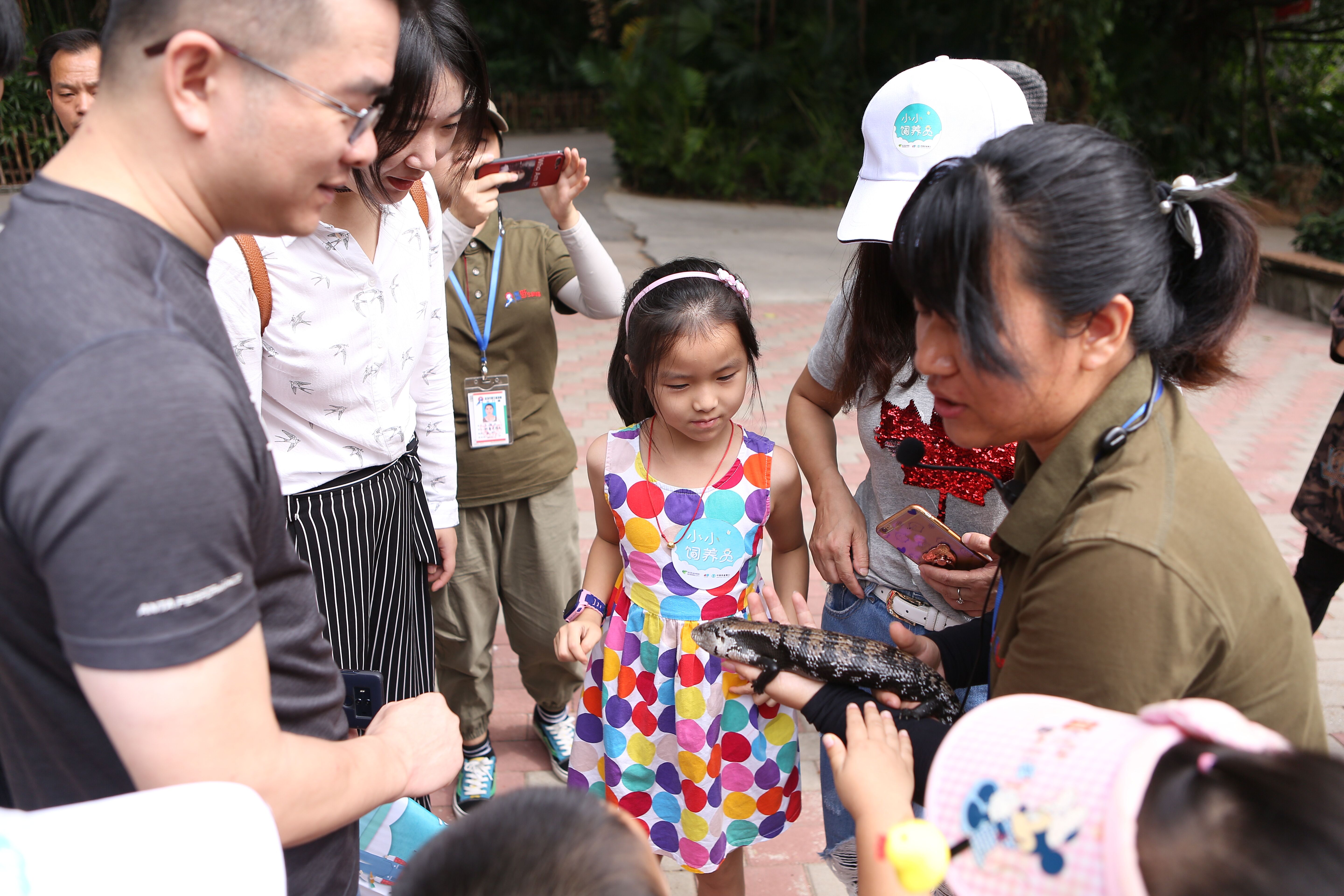 “鬃獅蜥和藍舌石龍子都是蜥蜴的一種。當遭受威脅時,鬃獅蜥會張開嘴及將帶刺的咽喉膨起來像一頭生氣的獅子。藍舌石龍子的舌頭是藍色的,平時會不時向外一伸一伸?!毙∨笥褌冋J真地聽科普導游講解兩種蜥蜴的區(qū)別,膽大的孩子則抱起蜥蜴仔細觀察起來。