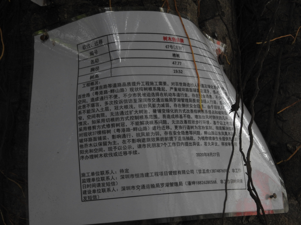 9月11日,市交通運(yùn)輸局羅湖管理局回應(yīng)表示,稱“經(jīng)核實(shí),百世路西段北側(cè)(畔山路以西)樹木為大葉榕,屬于榕樹的一種,榕樹有多種,如小葉榕、大葉榕、高山榕、垂葉榕等,百世路榕樹現(xiàn)狀根系已確實(shí)對人行道造成破壞?!睂τ谄渌鼧浔豢车那闆r,“僅對影響道路轉(zhuǎn)彎半徑(畔山路右轉(zhuǎn)百世路)的兩棵鳳凰樹遷移砍伐”。并在不影響遮陰的情況下“對北側(cè)過密其他喬木進(jìn)行抽梳”。