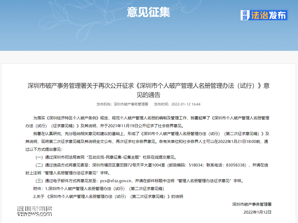 讀特客戶端?深圳新聞網(wǎng)2022年1月18日訊(記者 張玲)日前,深圳市破產(chǎn)事務(wù)管理署在深圳市司法局發(fā)布通告,面向社會征集《深圳市個人破產(chǎn)管理人名冊管理辦法(試行)》(以下簡稱管理辦法)的意見,有意提交者可在2022年1月21日18時前提交。