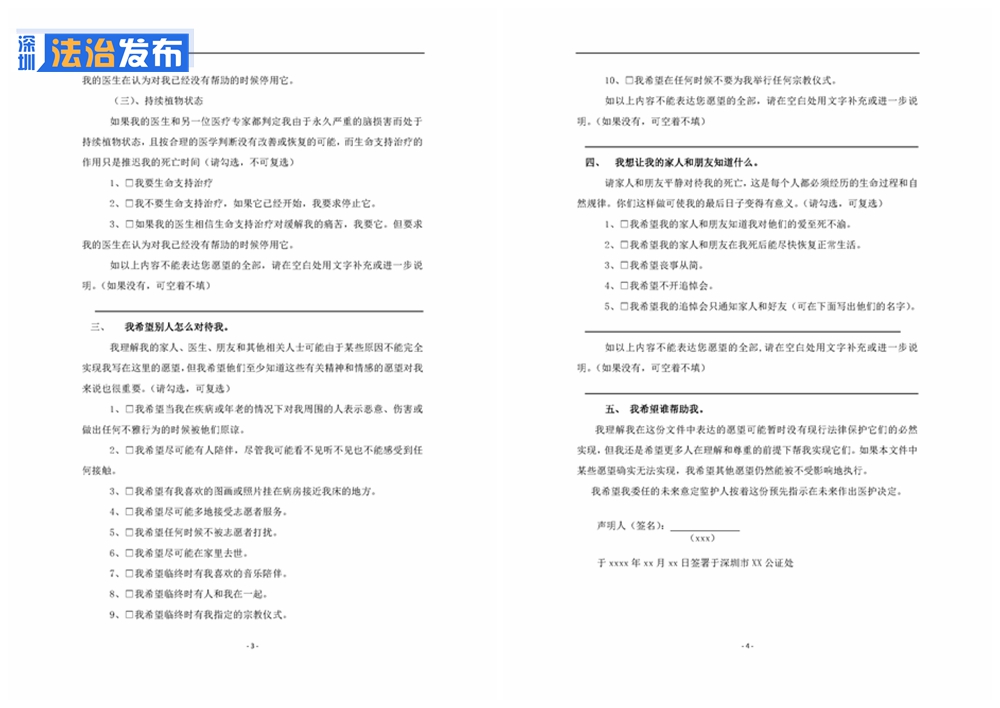 讀特客戶端·深圳新聞網(wǎng)2022年7月8日訊(記者 張玲 翁任瑩)7月5日,北京市盈科(深圳)律師事務所律師杜芹到深圳公證處,為自己做了一份生前預囑。這份生前預囑,有可能成為深圳首份公證的生前預囑。6月23日,深圳市人大常委會表決通過《深圳經(jīng)濟特區(qū)醫(yī)療條例》(以下簡稱《條例》),該《條例》將于2023年1月1日起施行。深圳通過立法率先建立的“生前預囑制度”可謂一石激起千層浪,引發(fā)全國網(wǎng)友和各方持續(xù)關(guān)注。