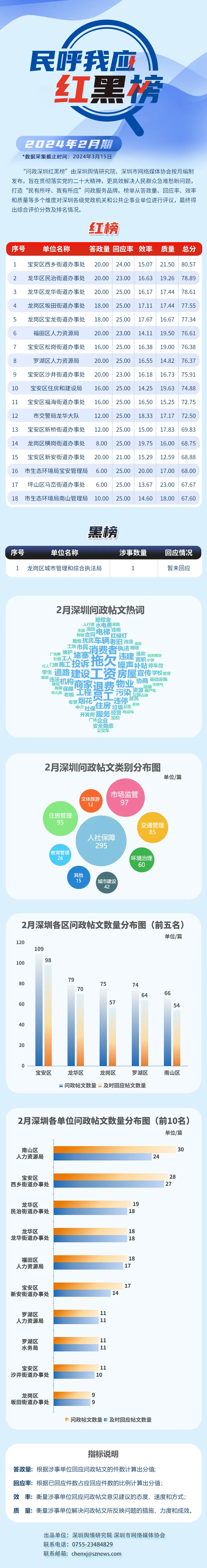 本期榜單采集的帖文主要來自深圳論壇、深圳各區(qū)政府官網(wǎng)、人民網(wǎng)領(lǐng)導(dǎo)留言板及深圳新聞網(wǎng)“民呼我應(yīng)”等平臺,所采集帖文發(fā)布時間為2024年2月1日至2月29日,采集截止時間為2024年3月15日。榜單具有科學(xué)、合理、完備的綜合評價體系,能夠從答政量、回應(yīng)率、效率和質(zhì)量等多個維度對深圳各級黨政機關(guān)和公共企事業(yè)單位進行評議。