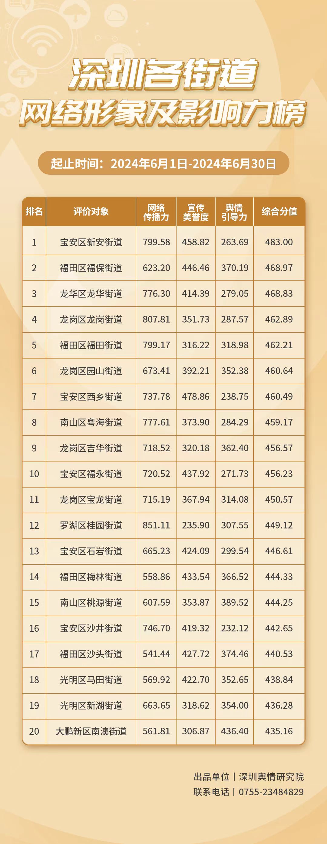 2024年6月,共有20個街道登上《深圳各街道網(wǎng)絡形象及影響力榜》,分別是:寶安區(qū)新安街道、福田區(qū)福保街道、龍華區(qū)龍華街道、龍崗區(qū)龍崗街道、福田區(qū)福田街道、龍崗區(qū)園山街道、寶安區(qū)西鄉(xiāng)街道、南山區(qū)粵海街道、龍崗區(qū)吉華街道、寶安區(qū)福永街道、龍崗區(qū)寶龍街道、羅湖區(qū)桂園街道、寶安區(qū)石巖街道、福田區(qū)梅林街道、南山區(qū)桃源街道、寶安區(qū)沙井街道、福田區(qū)沙頭街道、光明區(qū)馬田街道、光明區(qū)新湖街道、大鵬新區(qū)南澳街道。