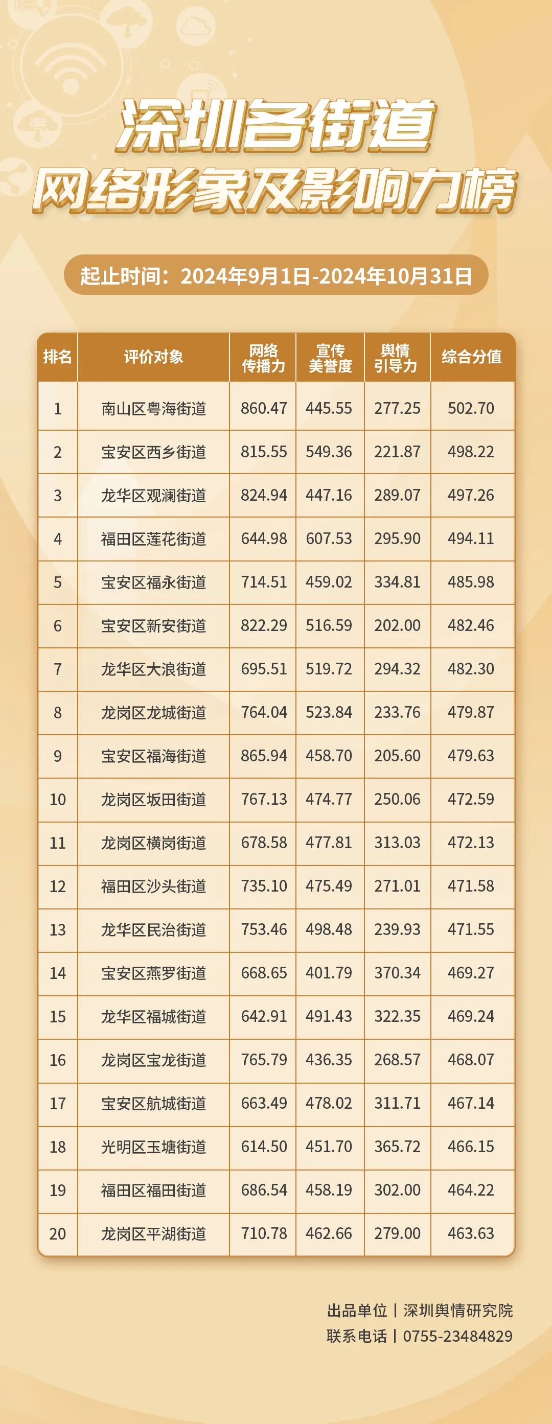2024年9-10月,各街道不斷探索治理新路徑,力求效能躍升,《深圳各街道網(wǎng)絡(luò)形象及影響力榜》為您揭曉哪些街道網(wǎng)絡(luò)形象治理實(shí)效顯著,成標(biāo)桿,本期榜單數(shù)據(jù)統(tǒng)計(jì)范圍為2024年9月1日至10月31日。