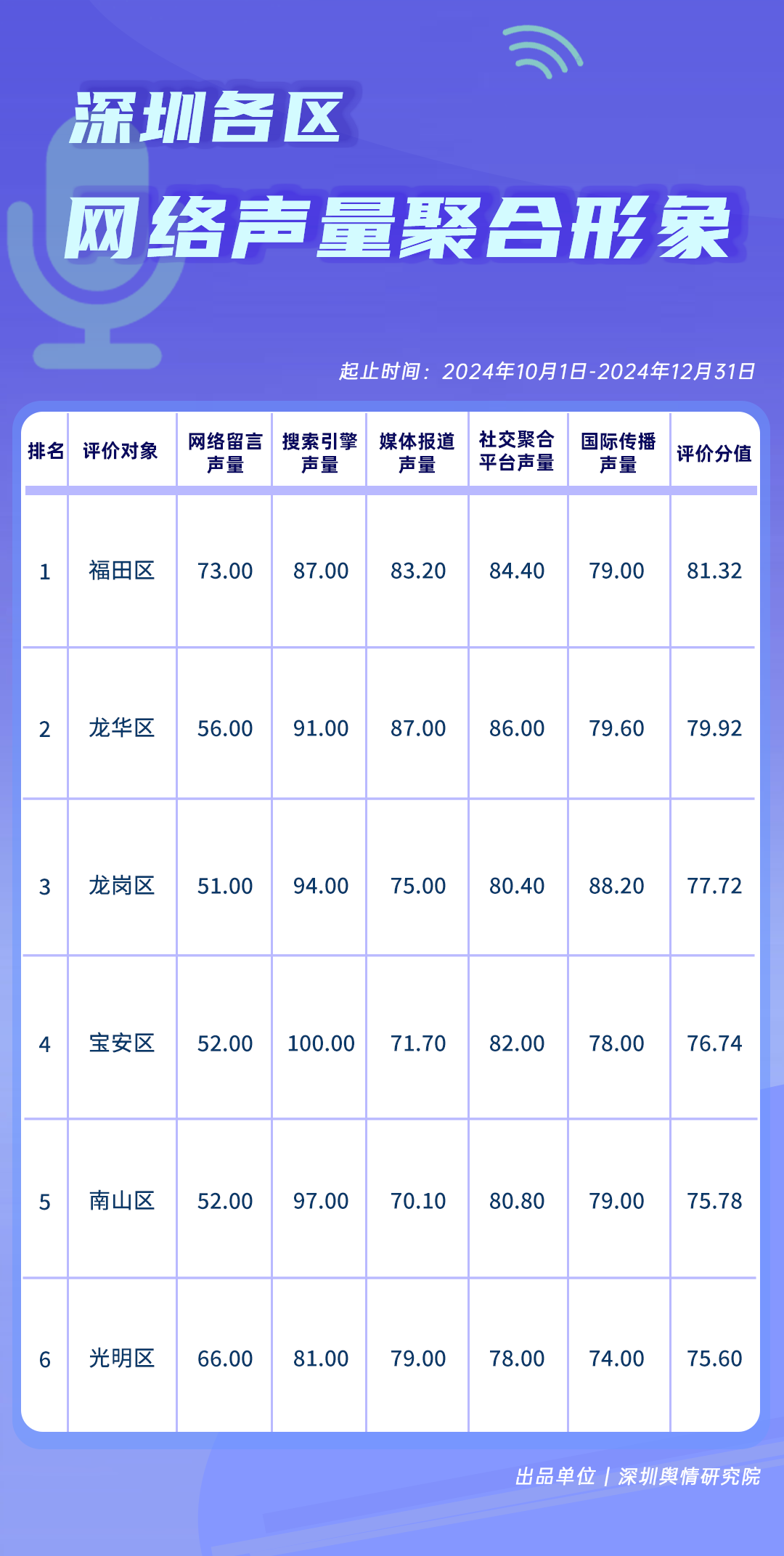 10-12月,福田區(qū)、龍崗區(qū)、光明區(qū)、龍華區(qū)、南山區(qū)、寶安區(qū)登上榜單前六。榜單中,福田區(qū)、龍崗區(qū)、光明區(qū)位列前三,綜合評價分值均在80分以上,居于榜單第四至第六名的龍華區(qū)、南山區(qū)、寶安區(qū)也在積極塑造網(wǎng)絡形象的道路上不斷邁進,展現(xiàn)了各區(qū)在網(wǎng)絡形象建設領域的蓬勃活力與持續(xù)努力。