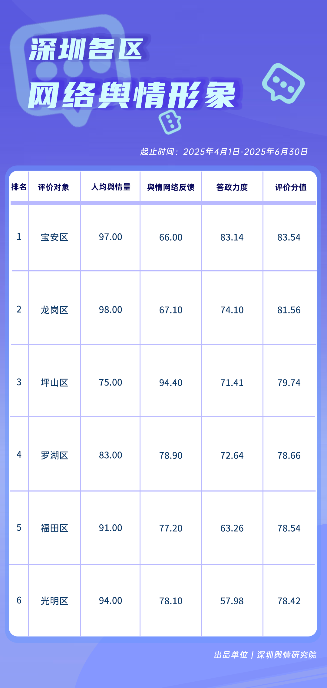 4-6月,各區(qū)各單位網(wǎng)絡(luò)形象建設(shè)取得了哪些成效?《深圳各區(qū)各單位網(wǎng)絡(luò)形象建設(shè)榜》帶您了解。本期榜單數(shù)據(jù)統(tǒng)計(jì)時(shí)間范圍為2025年4月1日至6月30日。