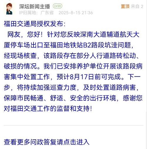 網(wǎng)友,您好!針對(duì)您反映深南大道輔道航天大廈停車場(chǎng)出口至福田地鐵站B2路段坑洼問(wèn)題,經(jīng)現(xiàn)場(chǎng)核查,該路段存在部分人行道路磚松動(dòng)、破損的情況。我們已安排養(yǎng)護(hù)單位開(kāi)展該路段病害集中處置工作,預(yù)計(jì)8月17日前可完成。下一步,將持續(xù)加強(qiáng)巡查力度,及時(shí)處置道路病害,保障市民暢通、舒適、安全的出行環(huán)境,感謝您對(duì)福田交通工作的監(jiān)督和支持!