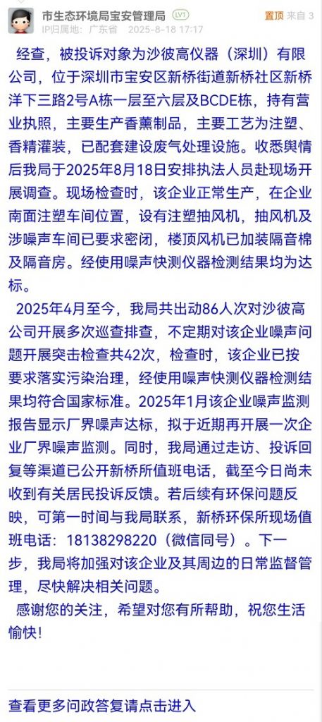 經(jīng)查,被投訴對(duì)象為沙彼高儀器(深圳)有限公司,位于深圳市寶安區(qū)新橋街道新橋社區(qū)新橋洋下三路2號(hào)A棟一層至六層及BCDE棟,持有營(yíng)業(yè)執(zhí)照,主要生產(chǎn)香薰制品,主要工藝為注塑、香精灌裝,已配套建設(shè)廢氣處理設(shè)施。收悉輿情后我局于2025年8月18日安排執(zhí)法人員赴現(xiàn)場(chǎng)開(kāi)展調(diào)查。現(xiàn)場(chǎng)檢查時(shí),該企業(yè)正常生產(chǎn),在企業(yè)南面注塑車間位置,設(shè)有注塑抽風(fēng)機(jī),抽風(fēng)機(jī)及涉噪聲車間已要求密閉,樓頂風(fēng)機(jī)已加裝隔音棉及隔音房。經(jīng)使用噪聲快測(cè)儀器檢測(cè)結(jié)果均為達(dá)標(biāo)。