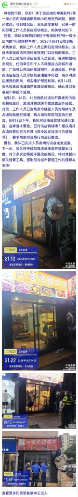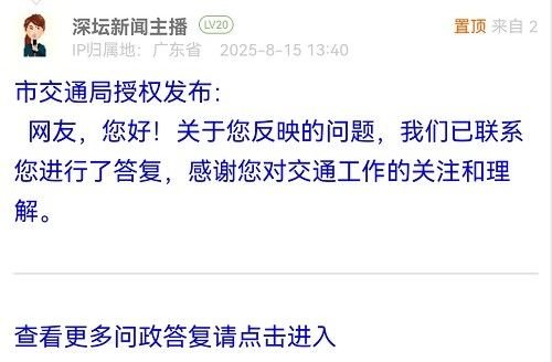 據(jù)統(tǒng)計(jì),2025年8月11日-2025年8月17日,網(wǎng)友在深圳論壇發(fā)布問(wèn)政類帖文共31篇,得到相關(guān)單位正式回應(yīng)的帖文數(shù)為31篇,本期簡(jiǎn)報(bào)回應(yīng)速度最快的單位:市市場(chǎng)監(jiān)督管理局光明監(jiān)管局、福田交通局、龍華區(qū)民治街道辦事處、南山區(qū)南頭街道辦事處、市公安局交通管理局龍崗大隊(duì)、龍崗區(qū)衛(wèi)生健康局、南山區(qū)城市管理和綜合執(zhí)法局、福田區(qū)梅林街道辦事處、羅湖區(qū)蓮塘街道辦事處。
