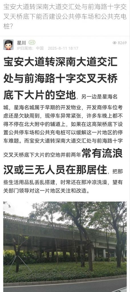 2. 帖文《寶安大道轉(zhuǎn)深南大道交匯處與前海路十字交叉天橋底下能否建設(shè)公共停車場(chǎng)和公共充電樁?》