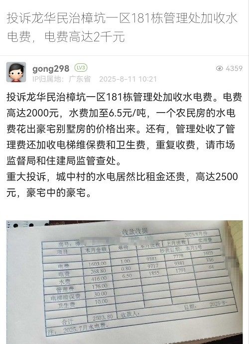1. 帖文《投訴龍華民治樟坑一區(qū)181棟管理處加收水電費(fèi),電費(fèi)高達(dá)2千元》