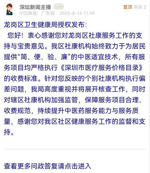 您好!衷心感謝您對(duì)龍崗區(qū)社康服務(wù)工作的支持與寶貴意見(jiàn)。我區(qū)社康機(jī)構(gòu)始終致力于為居民提供“簡(jiǎn)、便、驗(yàn)、廉”的中醫(yī)適宜技術(shù),所有服務(wù)項(xiàng)目均嚴(yán)格執(zhí)行《深圳市醫(yī)療服務(wù)價(jià)格目錄》的收費(fèi)標(biāo)準(zhǔn)。針對(duì)您反映的個(gè)別社康機(jī)構(gòu)執(zhí)行偏差問(wèn)題,我局高度重視并將展開(kāi)核查工作,同時(shí)對(duì)轄區(qū)社康機(jī)構(gòu)加強(qiáng)監(jiān)管,保障服務(wù)項(xiàng)目合理、收費(fèi)規(guī)范,持續(xù)提升中醫(yī)藥服務(wù)能力與服務(wù)質(zhì)量,感謝您對(duì)我區(qū)社區(qū)健康服務(wù)工作的監(jiān)督和支持。