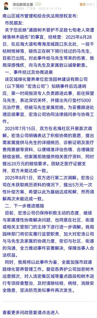 關(guān)于您反映“道路樹(shù)木管護(hù)不足致七旬老人突遭掉落林木砸傷”的事宜,經(jīng)核查:2025年6月28日,在后海大道和粵海龍城路口東北處,一段干枯樹(shù)枝掉落,砸傷正在樹(shù)下騎行經(jīng)過(guò)的馬先生,目前已出院。對(duì)此事件給馬先生帶來(lái)的傷害,我局深感愧疚,向馬先生及家屬致以誠(chéng)摯歉意。