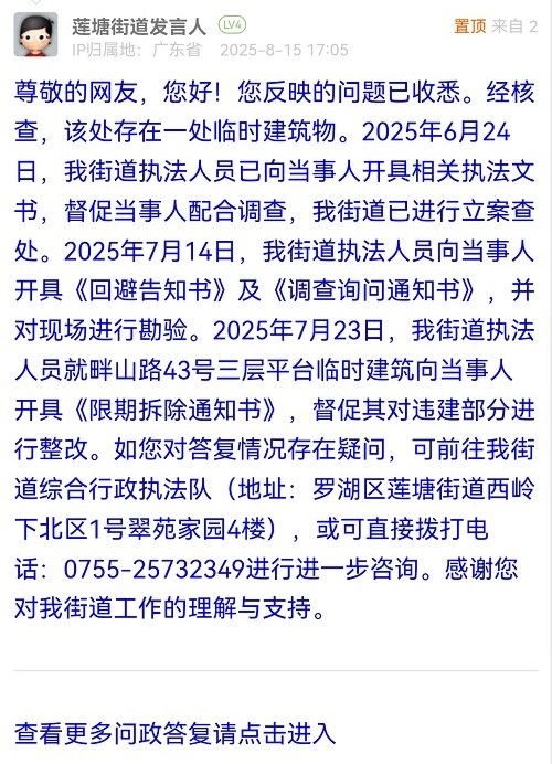 尊敬的網(wǎng)友,您好!您反映的問(wèn)題已收悉。經(jīng)核查,該處存在一處臨時(shí)建筑物。2025年6月24日,我街道執(zhí)法人員已向當(dāng)事人開(kāi)具相關(guān)執(zhí)法文書,督促當(dāng)事人配合調(diào)查,我街道已進(jìn)行立案查處。2025年7月14日,我街道執(zhí)法人員向當(dāng)事人開(kāi)具《回避告知書》及《調(diào)查詢問(wèn)通知書》,并對(duì)現(xiàn)場(chǎng)進(jìn)行勘驗(yàn)。2025年7月23日,我街道執(zhí)法人員就畔山路43號(hào)三層平臺(tái)臨時(shí)建筑向當(dāng)事人開(kāi)具《限期拆除通知書》,督促其對(duì)違建部分進(jìn)行整改。如您對(duì)答復(fù)情況存在疑問(wèn),可前往我街道綜合行政執(zhí)法隊(duì)(地址:羅湖區(qū)蓮塘街道西嶺下北區(qū)1號(hào)翠苑家園4樓),或可直接撥打電話:0755-25732349進(jìn)行進(jìn)一步咨詢。感謝您對(duì)我街道工作的理解與支持。