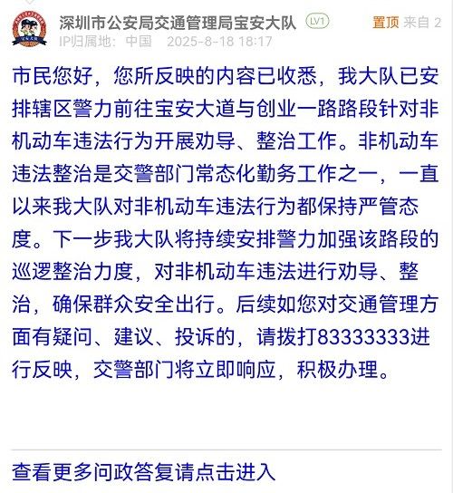 市民您好,您所反映的內(nèi)容已收悉,我大隊(duì)已安排轄區(qū)警力前往寶安大道與創(chuàng)業(yè)一路路段針對(duì)非機(jī)動(dòng)車違法行為開(kāi)展勸導(dǎo)、整治工作。非機(jī)動(dòng)車違法整治是交警部門常態(tài)化勤務(wù)工作之一,一直以來(lái)我大隊(duì)對(duì)非機(jī)動(dòng)車違法行為都保持嚴(yán)管態(tài)度。下一步我大隊(duì)將持續(xù)安排警力加強(qiáng)該路段的巡邏整治力度,對(duì)非機(jī)動(dòng)車違法進(jìn)行勸導(dǎo)、整治,確保群眾安全出行。后續(xù)如您對(duì)交通管理方面有疑問(wèn)、建議、投訴的,請(qǐng)撥打83333333進(jìn)行反映,交警部門將立即響應(yīng),積極辦理。