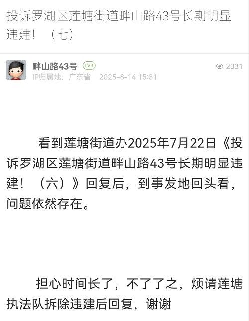 15. 帖文《投訴羅湖區(qū)蓮塘街道畔山路43號(hào)長(zhǎng)期明顯違建?。ㄆ撸?/a>》