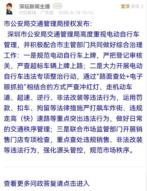 深圳市公安局交通管理局高度重視電動(dòng)自行車管理,并積極配合市主管部門共同做好綜合治理工作:一是規(guī)范電動(dòng)自行車上牌,嚴(yán)把登記審核關(guān),嚴(yán)查超標(biāo)車輛上牌上路;二是大力開(kāi)展電動(dòng)自行車違法專項(xiàng)整治行動(dòng),通過(guò)“路面查處+電子眼抓拍”相結(jié)合的方式嚴(yán)查沖紅燈、走機(jī)動(dòng)車道、超速、逆行、非法改裝等違法行為,運(yùn)用罰款、扣車、拘留等法律措施嚴(yán)打飆車炸街、違規(guī)走高(快)速路等重點(diǎn)突出違法行為,做好日常的交通秩序管理;三是聯(lián)合市場(chǎng)監(jiān)管部門開(kāi)展銷售門店專項(xiàng)檢查,重點(diǎn)查處違規(guī)銷售、非法改裝等違法行為,強(qiáng)化源頭管控,規(guī)范市場(chǎng)秩序。