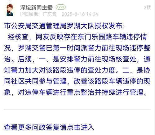 經(jīng)核查,網(wǎng)友反映存在東門樂(lè)園路車輛違停情況,羅湖交警已第一時(shí)間派警力前往現(xiàn)場(chǎng)違停整治。后續(xù),一、是安排警力前往現(xiàn)場(chǎng)核查處,通知警力加大對(duì)該路段違停的查處力度。二、是協(xié)同社區(qū)共同參與管理,改善該路段車輛違停的現(xiàn)象,對(duì)違停車輛進(jìn)行重點(diǎn)整治并持續(xù)進(jìn)行管理。