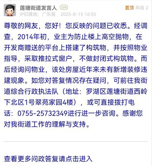 尊敬的網(wǎng)友,您好!您反映的問(wèn)題已收悉。經(jīng)調(diào)查,2014年初,業(yè)主為防止樓上高空拋物,在開(kāi)發(fā)商贈(zèng)送的平臺(tái)上搭建了構(gòu)筑物,并按照物業(yè)指導(dǎo),采取推拉式窗戶,不做封閉式構(gòu)筑物。而后經(jīng)詢問(wèn)物業(yè),該處房屋近年來(lái)未有新增裝修違建現(xiàn)象。如您對(duì)答復(fù)情況存在疑問(wèn),可前往我街道綜合行政執(zhí)法隊(duì)(地址:羅湖區(qū)蓮塘街道西嶺下北區(qū)1號(hào)翠苑家園4樓),或可直接撥打電話:0755-25732349進(jìn)行進(jìn)一步咨詢。感謝您對(duì)我街道工作的理解與支持。