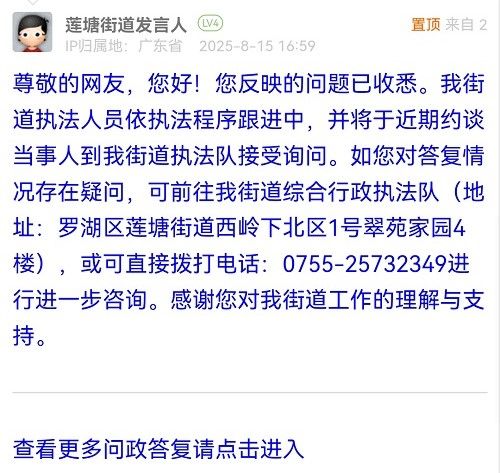 尊敬的網(wǎng)友,您好!您反映的問(wèn)題已收悉。我街道執(zhí)法人員依執(zhí)法程序跟進(jìn)中,并將于近期約談當(dāng)事人到我街道執(zhí)法隊(duì)接受詢問(wèn)。如您對(duì)答復(fù)情況存在疑問(wèn),可前往我街道綜合行政執(zhí)法隊(duì)(地址:羅湖區(qū)蓮塘街道西嶺下北區(qū)1號(hào)翠苑家園4樓),或可直接撥打電話:0755-25732349進(jìn)行進(jìn)一步咨詢。感謝您對(duì)我街道工作的理解與支持。