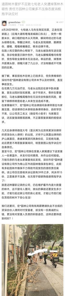11. 帖文《道路樹(shù)木管護(hù)不足致七旬老人突遭掉落林木砸傷 責(zé)任方園林公司案多不壓身態(tài)度消極拖字訣應(yīng)對(duì)》