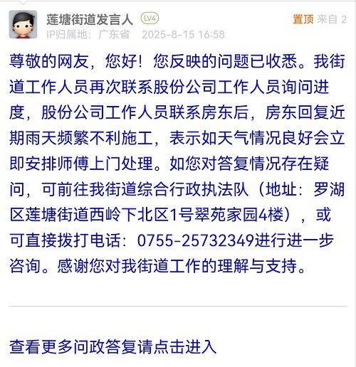 尊敬的網(wǎng)友,您好!您反映的問(wèn)題已收悉。我街道工作人員再次聯(lián)系股份公司工作人員詢問(wèn)進(jìn)度,股份公司工作人員聯(lián)系房東后,房東回復(fù)近期雨天頻繁不利施工,表示如天氣情況良好會(huì)立即安排師傅上門處理。如您對(duì)答復(fù)情況存在疑問(wèn),可前往我街道綜合行政執(zhí)法隊(duì)(地址:羅湖區(qū)蓮塘街道西嶺下北區(qū)1號(hào)翠苑家園4樓),或可直接撥打電話:0755-25732349進(jìn)行進(jìn)一步咨詢。感謝您對(duì)我街道工作的理解與支持。