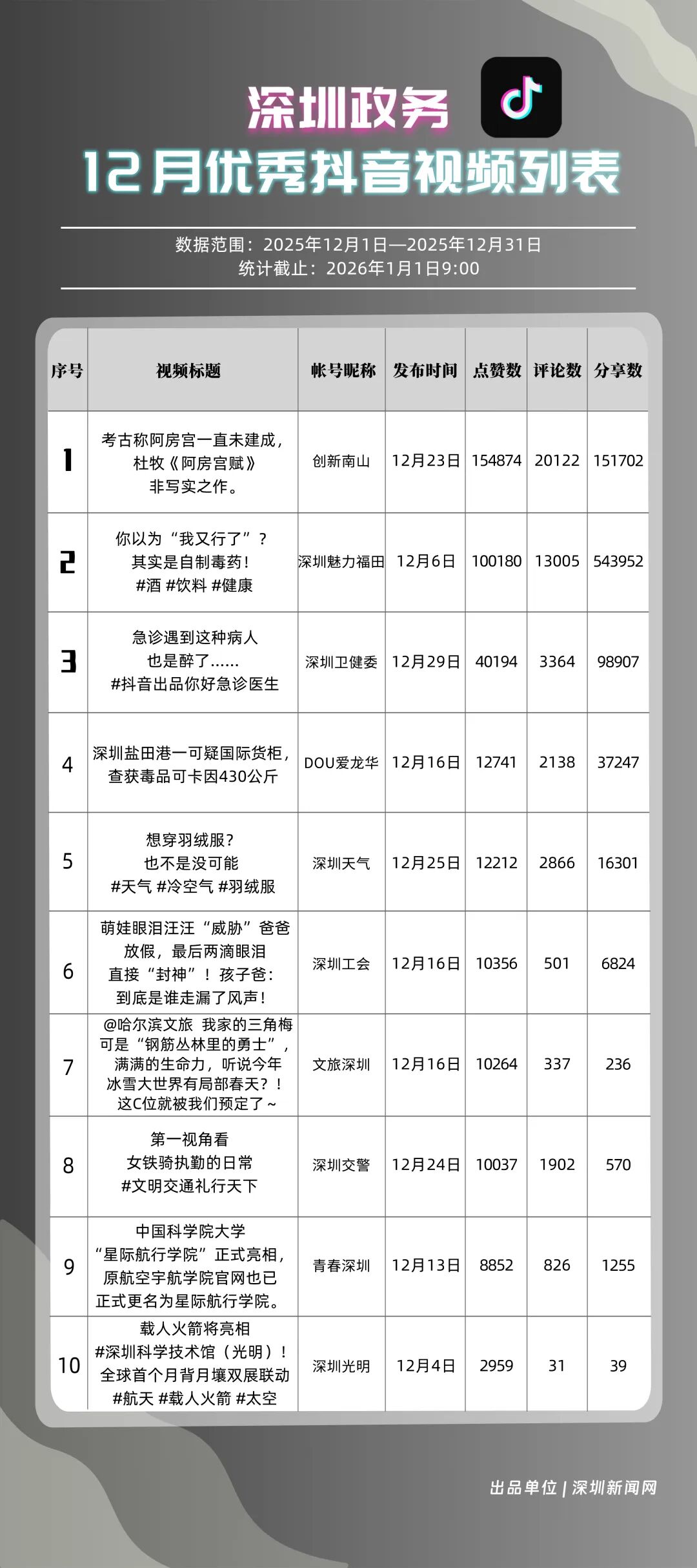 12月,獲得“優(yōu)秀政務(wù)抖音號”稱號的是“創(chuàng)新南山”“深圳魅力福田”“深圳衛(wèi)健委”“深圳天氣”“DOU愛龍華”“青春深圳”“深圳交警”“深汕發(fā)布”“深圳工會”“文旅深圳”?!皠?chuàng)新南山”積極傳播傳統(tǒng)文化、民生健康等多元內(nèi)容,當(dāng)月視頻總點(diǎn)贊數(shù)超120萬,位居榜首;“深圳魅力福田”內(nèi)容激發(fā)用戶主動(dòng)轉(zhuǎn)發(fā)熱情,在傳播指數(shù)評分較高,位列第二名;“深圳衛(wèi)健委”聚焦民生健康話題,產(chǎn)出高質(zhì)量視頻內(nèi)容,排名上升至第三?!吧钲谔鞖狻薄癉OU愛龍華”“青春深圳”等賬號評分均在86分以上,反映出賬號的內(nèi)容質(zhì)量與用戶粘性突出。上榜政務(wù)抖音號在短視頻傳播賽道持續(xù)深耕,憑借精準(zhǔn)的內(nèi)容定位與創(chuàng)新的傳播手法,成功打造出極具影響力的政務(wù)傳播矩陣。