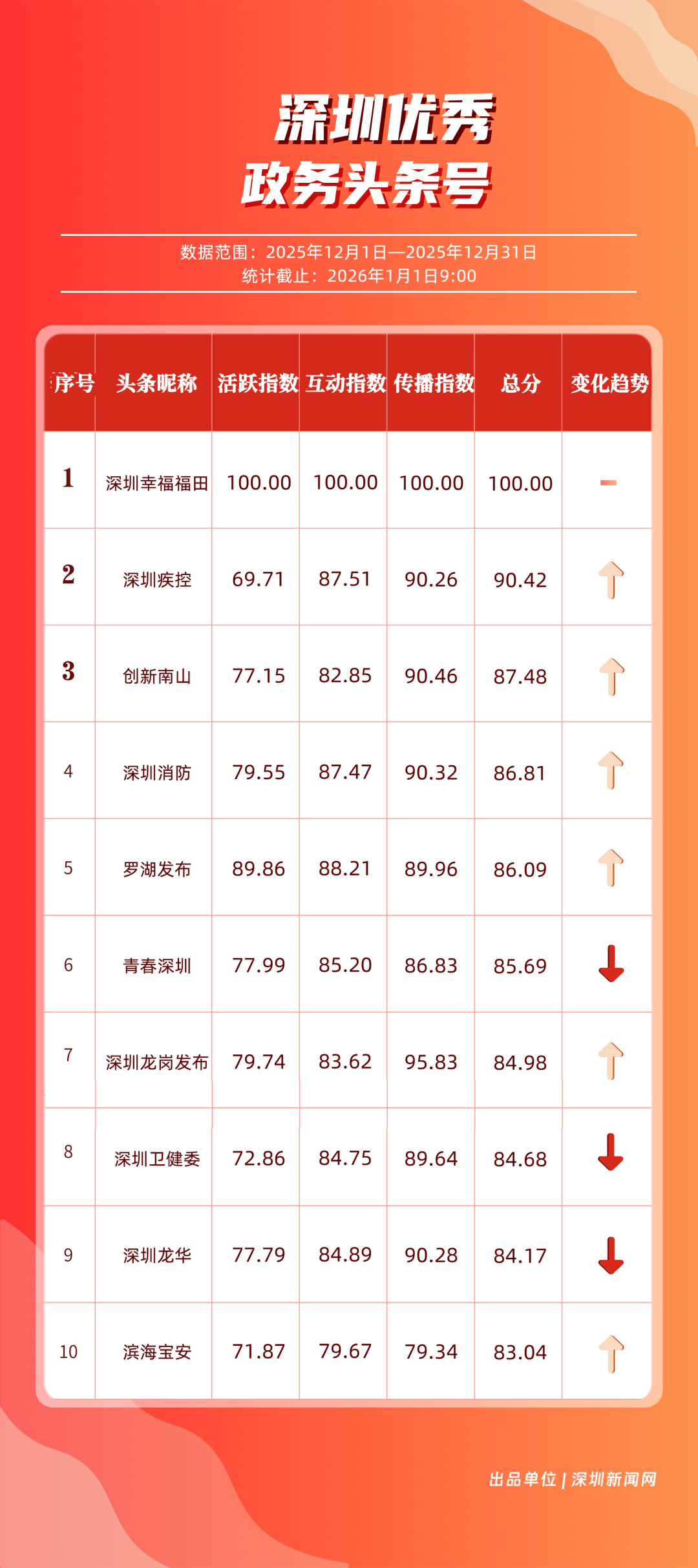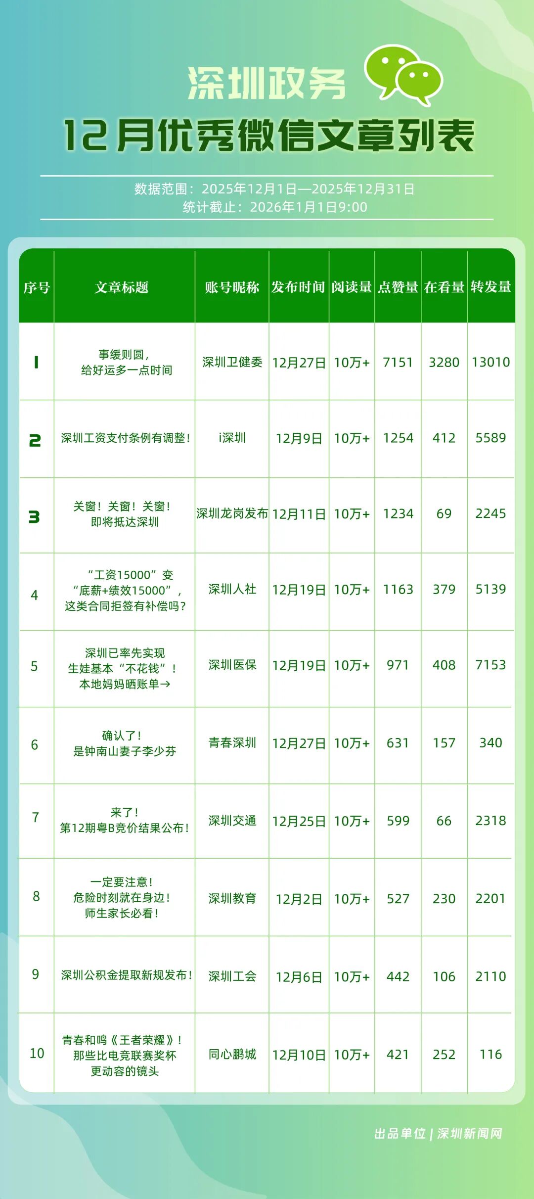12月,“深圳衛(wèi)健委”“深圳龍崗發(fā)布”“幸福福田”“i深圳”“青春深圳”“深圳光明”“深圳工會”“創(chuàng)新南山”“深圳龍華”“羅湖發(fā)布”等30個(gè)政務(wù)微信公眾號榮登“深圳優(yōu)秀政務(wù)微信公眾號”榜單。12月榜單中,頭部政務(wù)賬號優(yōu)勢穩(wěn)固,腰部賬號競爭激烈?!吧钲谛l(wèi)健委”延續(xù)強(qiáng)勁表現(xiàn),在活躍、互動(dòng)、傳播維度均斬獲滿分,60余篇文章閱讀超10萬,蟬聯(lián)榜首;“深圳龍崗發(fā)布”在互動(dòng)、傳播方面表現(xiàn)亮眼,穩(wěn)居榜單第二;“幸福福田”也在互動(dòng)、傳播方面具備一定優(yōu)勢,以穩(wěn)定的內(nèi)容輸出與用戶口碑,居于榜單第三?!吧钲诠饷鳌薄吧钲邶埲A”“羅湖發(fā)布”等政務(wù)賬號不斷拓展信息發(fā)布維度、深化服務(wù)場景打造,排名較上期有所提升。上榜微信公眾號以高質(zhì)量內(nèi)容為核心競爭力,在政務(wù)傳播賽道持續(xù)發(fā)力,為推動(dòng)政務(wù)信息公開、服務(wù)民生需求搭建了高效的溝通橋梁。