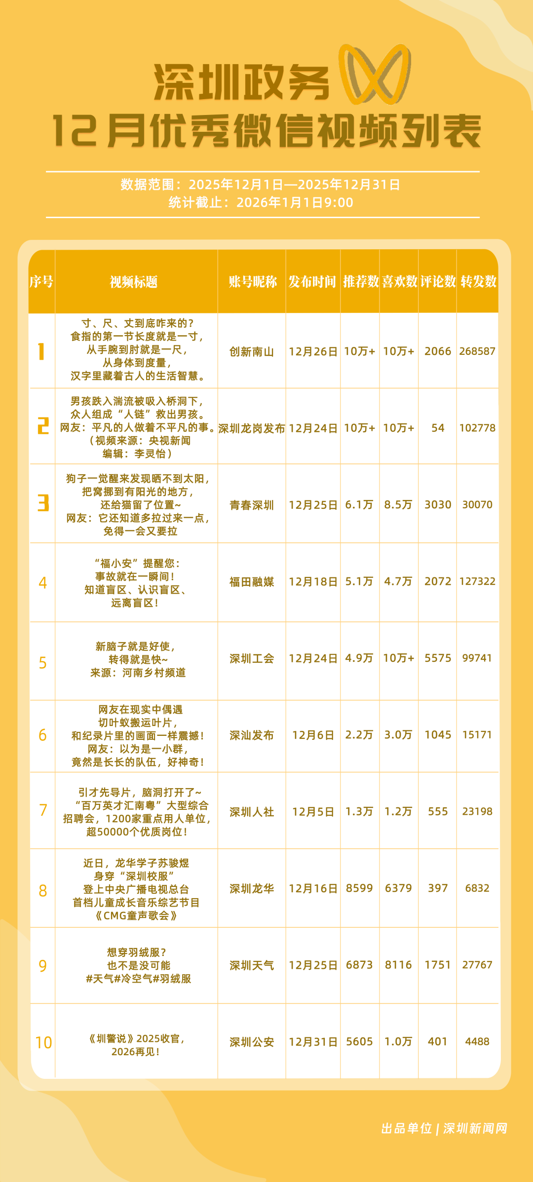 12月,“創(chuàng)新南山”“深圳工會”“青春深圳”“福田融媒”“深圳龍崗發(fā)布”“深汕發(fā)布”“深圳天氣”“深圳光明”“深圳龍華”“深圳人社”榮獲“優(yōu)秀政務(wù)微信視頻號”稱號。“創(chuàng)新南山”活躍指數(shù)、傳播指數(shù)均獲滿分,月作品總轉(zhuǎn)發(fā)量超70萬,領(lǐng)跑榜單;“深圳工會”積極發(fā)布熱點(diǎn)、民生類內(nèi)容,精準(zhǔn)對接市民需求,排名上升至第二名;“青春深圳”互動(dòng)指數(shù)超98分,以高互動(dòng)量位列榜單第三名。“福田融媒”“深圳龍崗發(fā)布”兩賬號立足區(qū)域特色深耕內(nèi)容,得分超90分。上榜微信視頻號以輕量化短視頻為載體,傳播公眾喜聞樂見的政務(wù)、民生內(nèi)容,打造出兼具傳播力與親和力的政務(wù)宣傳新名片。