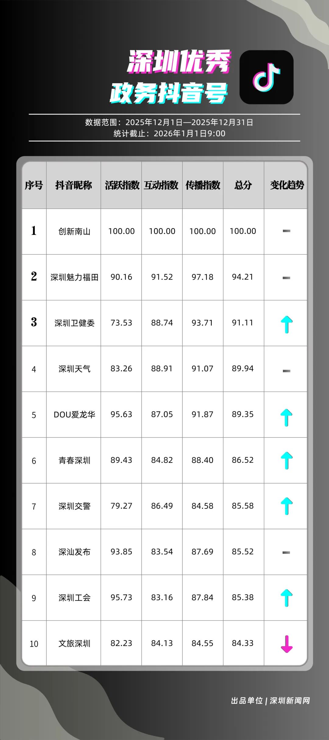 12月,深圳政務(wù)新媒體矩陣持續(xù)深耕內(nèi)容生態(tài),各單位依托平臺特色深化服務(wù)效能,南山區(qū)、福田區(qū)、市衛(wèi)生健康委員會、市總工會、龍崗區(qū)、市氣象局(臺)、光明區(qū)、中國共產(chǎn)主義青年團(tuán)深圳市委員會、龍華區(qū)、深汕特別合作區(qū)的新媒體矩陣入選“深圳優(yōu)秀政務(wù)新媒體矩陣”榜單。12月,南山區(qū)新媒體矩陣中,“創(chuàng)新南山”賬號在抖音平臺保持高質(zhì)量創(chuàng)作態(tài)勢,單賬號單月視頻總點(diǎn)贊量突破120萬,視頻號平臺同樣表現(xiàn)亮眼,單月視頻總轉(zhuǎn)發(fā)量超70萬,憑借雙平臺滿分的傳播表現(xiàn),位居榜單首位;福田區(qū)新媒體矩陣表現(xiàn)均衡穩(wěn)定,在各平臺得分均在92分以上,以93.94分的總成績位列第二;市衛(wèi)生健康委員會新媒體矩陣在微信公眾號持續(xù)輸出專業(yè)優(yōu)質(zhì)內(nèi)容,在該平臺獲得滿分,助力其以92.21分的總分排名第三位。此外,市總工會、龍崗區(qū)新媒體矩陣總分均超90分,以“各美其美”的發(fā)展態(tài)勢,展現(xiàn)深圳政務(wù)新媒體矩陣的蓬勃生機(jī)。