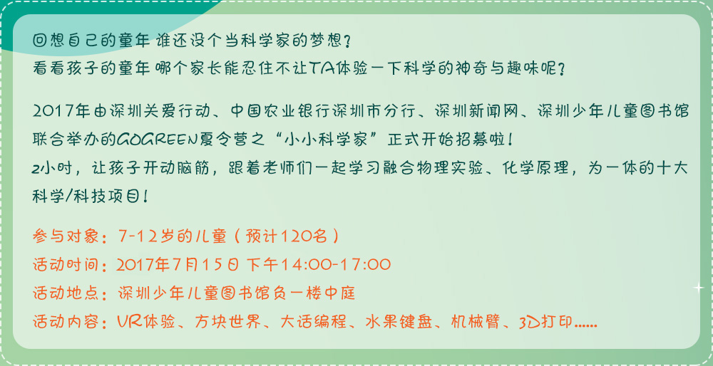 GO GREEN綠色夏令營之“小小科學家”活動由深圳市關愛辦、中國農(nóng)業(yè)銀行深圳市分行、深圳新聞網(wǎng)、深圳市少年兒童圖書館聯(lián)合舉辦。2個小時的活動,讓孩子開動腦筋,跟著老師學習融合物理實驗、化學原理,為一體的十大科學/科技項目。[詳細]